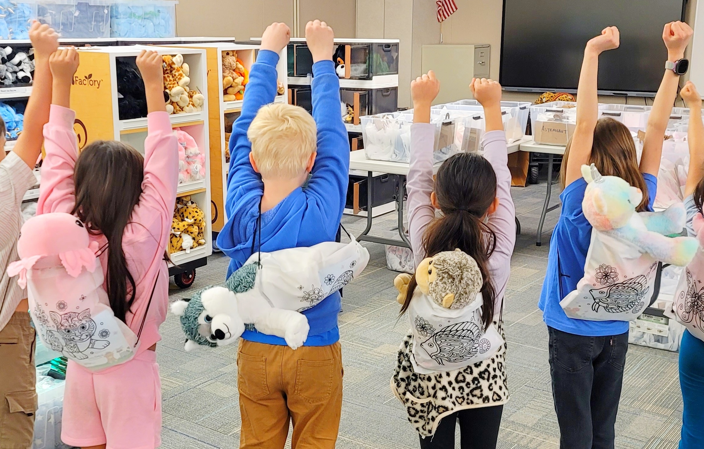 2-3 volunteers are always welcome at the writing party. One volunteer to help bring groups to the Stuffing Party. One volunteer to help zip up stuffed animals after they have been stuffed. One volunteer to help gather student's prizes. Volunteers can be parents, staff, PTA, etc. Volunteers receive a stuffed animal in return for their help.